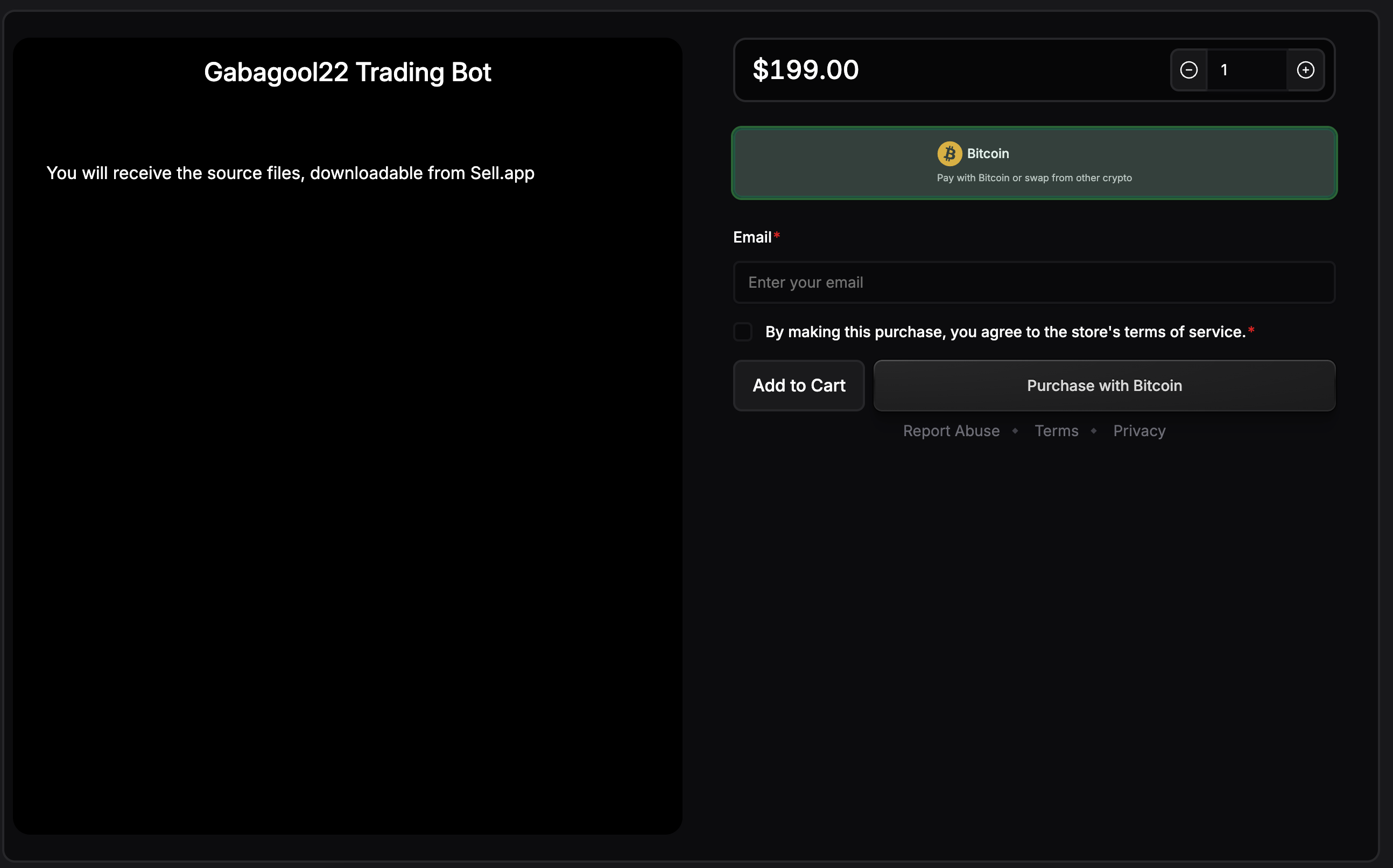 • Docker image • Configuration files with algorithm profiles • Backtesting scripts and analysis tools • 50GB+ scraped market data • Weekly updates via sell.app